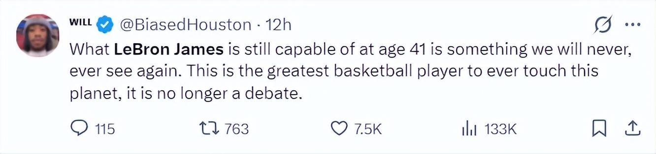 休媒Will都被詹姆斯打服了,他写道:41岁的勒布朗在这个年纪依旧能展示非凡的水准,这是我们未来再也无法看到的了,他就是这个星球上最伟大的篮球运动员,这一点毋庸置疑。